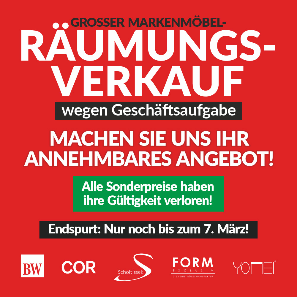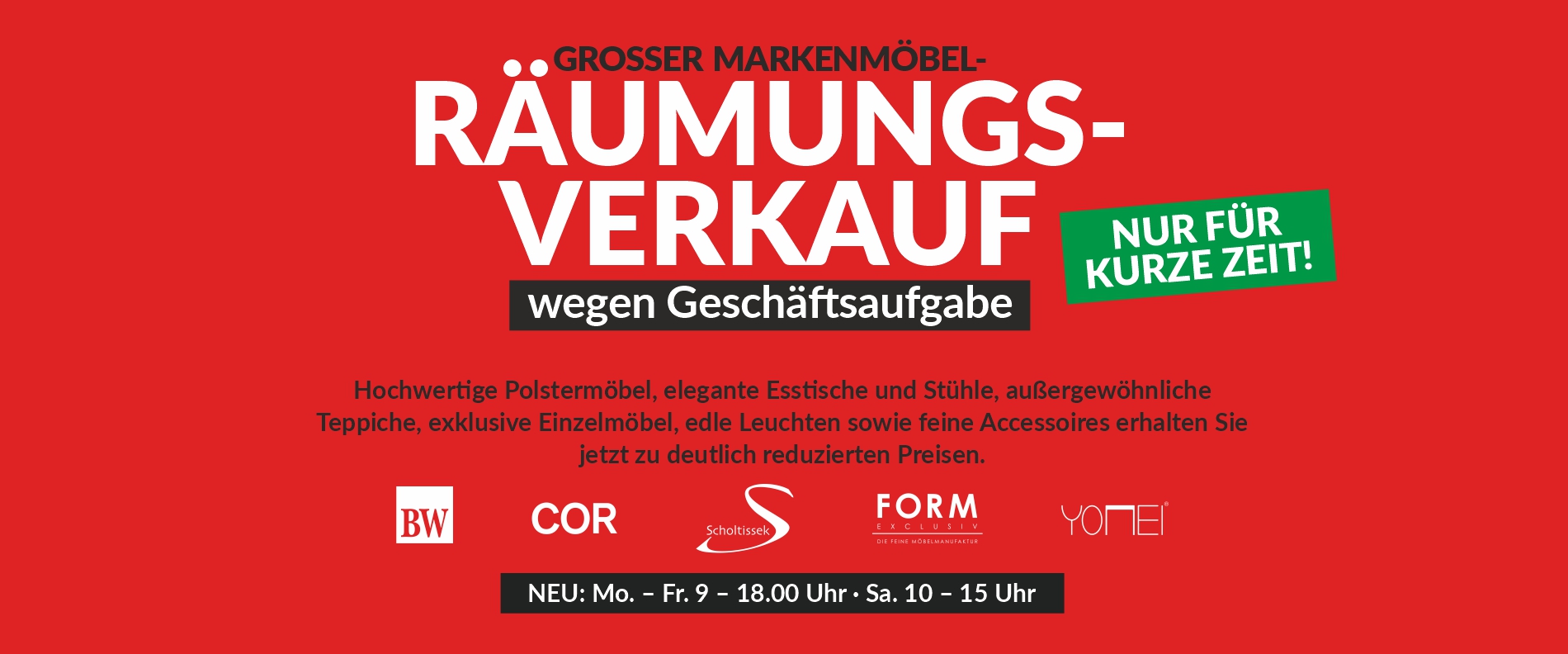 Danke für eine wunderbare Zeit – und herzlich willkommen zum Räumungsverkauf wegen Geschäftsaufgabe! Seit über 50 Jahren begleiten wir in Minden und der Region Menschen auf ihrem Weg zu klassisch elegantem Wohnen und stilvollem Einrichten. Unser größtes Ziel war es immer, unseren Kunden ein inspirierendes Einkaufserlebnis zu bieten und ihre persönlichen Wohnträume Wirklichkeit werden zu […]